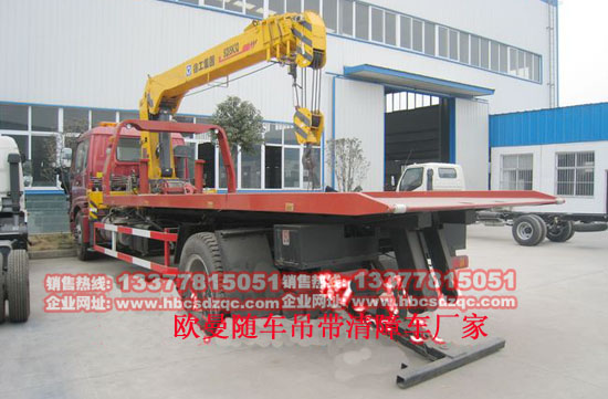 欧曼牌多功能随车吊:单桥欧曼多功能随车吊,可以配10吨--2吨直、折臂吊机。这款车还可以根据用户的需求来装清障车,平板一拖二的功能。整车配备2部80KN卷扬机(液压绞盘)、40米钢丝绳、两节六边型吊臂,三节托臂,分体式车厢,双侧联动操作装置,前保险杠装有配重,后工作灯3只,1个洗手箱,U型抱胎装置1套,托叉5对,托叉座1对,链钩2条,1个长排工程警灯,辅助灯总成1套,辅助制动气管总成1套。