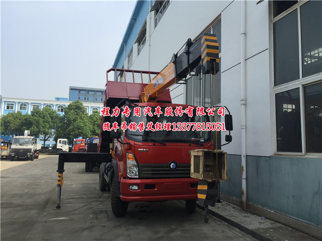 重汽王牌随车吊配程力5吨吊机PK徐工5吨吊机:这款车子的整车大梁250的随车吊专用底盘,配5吨的吊机最适合,其主要配置:3760排量,功率(Kw)95,底盘型号CDW1120HA2R4,五档带副,250的大梁,4.3米的大厢。