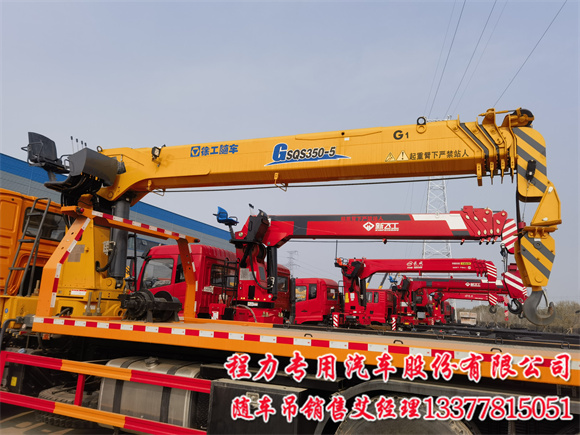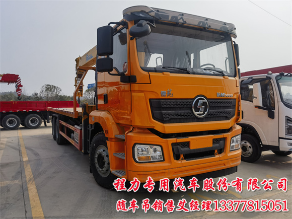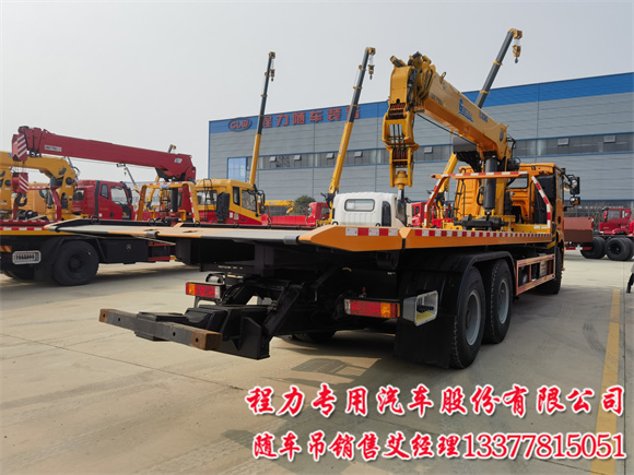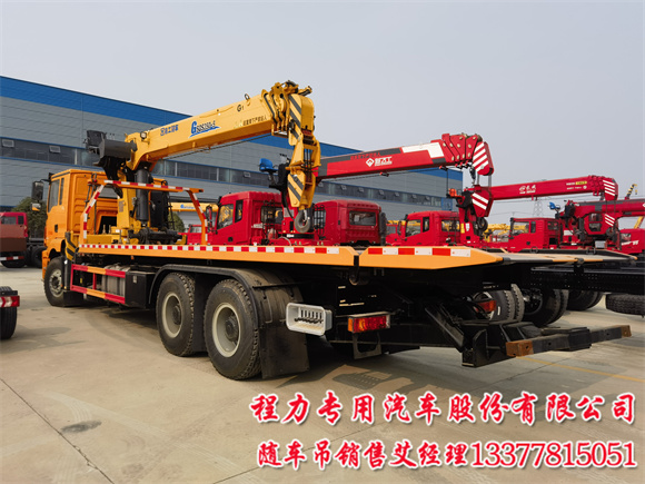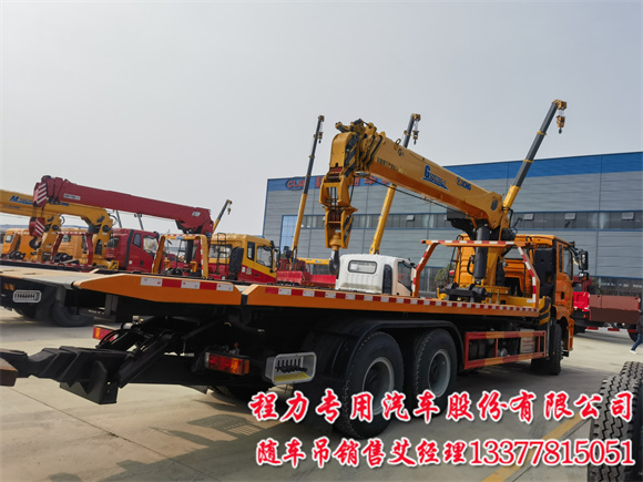 陕汽后双桥随车吊一拖二清障车配吊分析:一般来说配12吨各大品牌吊机-是常配,徐工12吨K型,G四节和G五节臂新款吊机,也可配石煤,三一,大力神,宏昌天马,程力本部吊机等,大臂长度不同,整车价格不同,加装遥控器,加装小钩。
