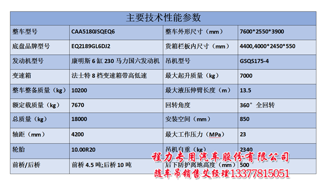 东风5吨6吨7吨四驱随车吊配置:4×4驱动,6缸230马力康明斯,8档带高低速法士特,随车吊专用分动箱可转换,轴距4200mm,四驱轮胎,货厢尺寸(mm) 4400,4000×2450×550,外形尺寸(mm) 7600×2550×3900,总质量(Kg) 18000,整备质量(Kg) 10200,这款车车子的主要参数。